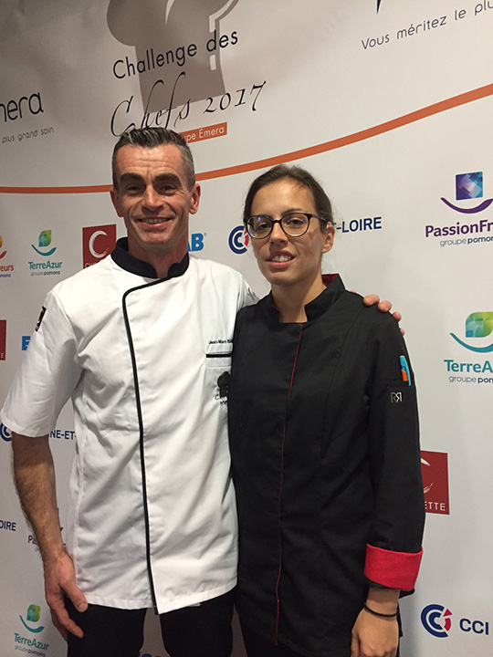 Jean-Marc BARDET, chef de la Résidence du Lac de Maine à Angers remporte la finale. Accompagné de la jeune et talentueuse apprentie, Lisa GOMES il s’exprime sur ce résultat : « Je suis très ému d’avoir été désigné gagnant de cette édition du Challenge des Chefs. Lisa et moi avons beaucoup travaillé pour cette compétition et aujourd’hui nous sommes comblés de joie et de fierté. Depuis 2 ans, nous travaillons ensemble et communiquons par les sensations que nous apportent notre travail au quotidien. Lisa est une jeune femme malentendante et gagner ce Challenge avec elle à mes côtés est l’aboutissement d’une grande complicité. C’est aussi, à mon sens, une belle leçon de vie ».