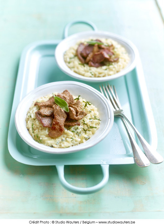 Servir les lamelles d’agneau parsemées d’un peu de sauge hachée sur un lit de rizotto au gorgonzola.