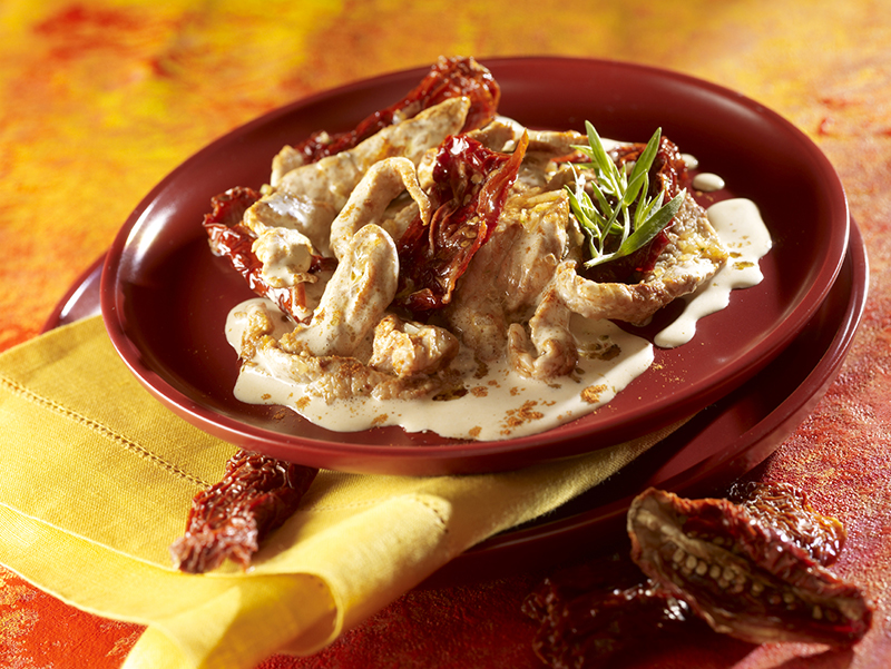 ②• Faire sauter les lanières de veau, 4 à 5 minutes à feu vif, dans une poêle antiadhésive bien chaude puis verser la crème et porter à ébullition, saler modérément, poivrer et ajouter les tomates séchées coupées en gros morceaux.