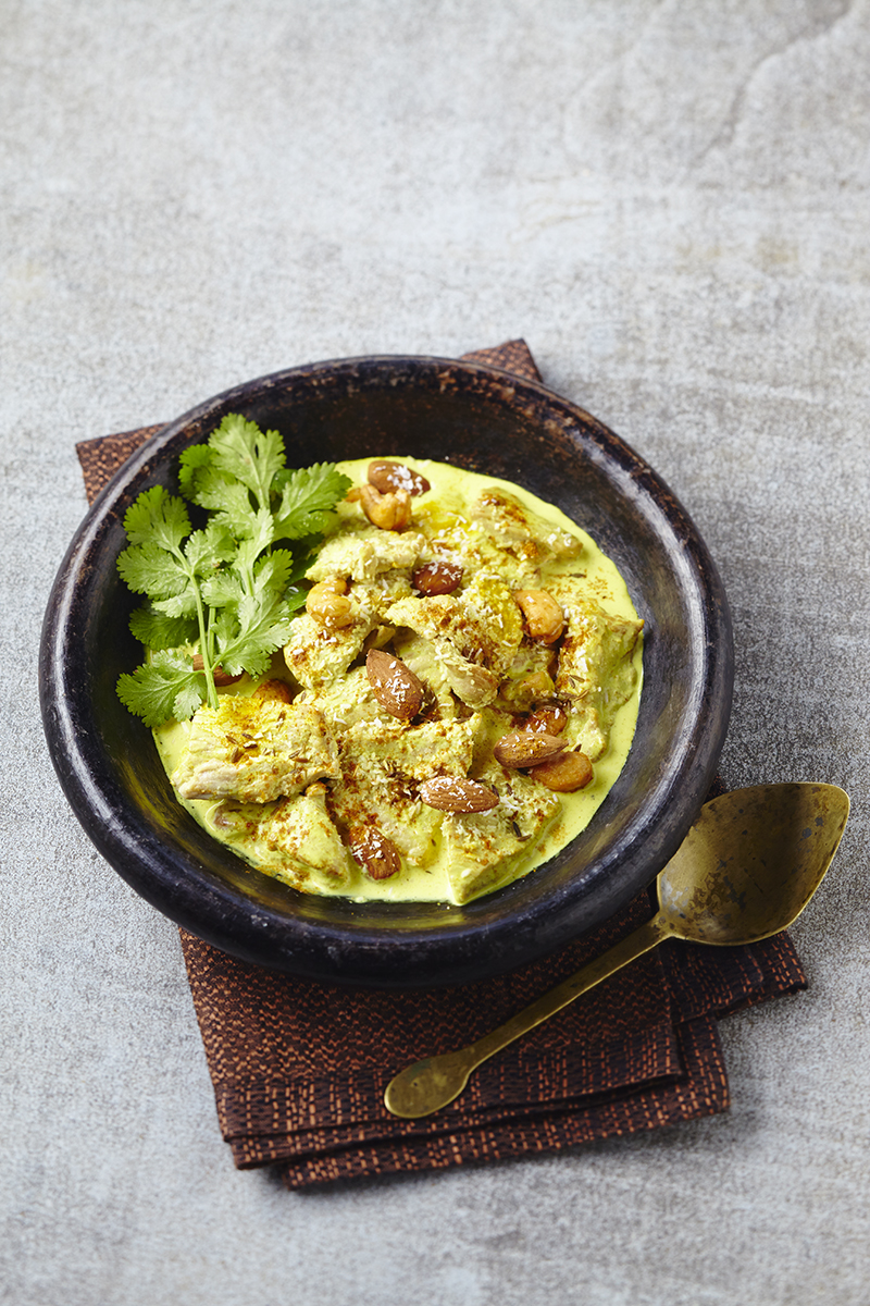 Servir l’émincé de veau curry-coco recouvert de coco râpé, de noix de cajou, d’amandes et de coriandre, et accompagné d’un riz basmati.
