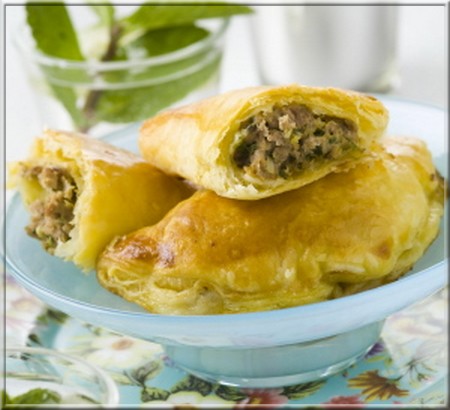 3- Couper 6 ronds de 10 cm de diamètre dans la pâte. Poser au centre une cuillère à soupe de farce.