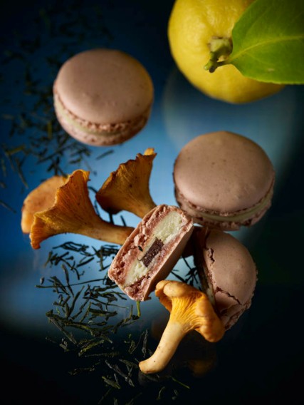 Sous ses airs de joli jardin rosé, ce macaron s’impose comme une surprise. Inspiré de la note iodée de l’« océan », empruntée au répertoire de la parfumerie, mêlant les saveurs de la girolle, du citron et du thé vert sencha, Pierre Hermé se réapproprie les goûts pour composer son propre parfum. Une juste composition qui laisse une saveur douce, végétale, au palais. Déroutante, elle fait naviguer l’imaginaire, au loin…