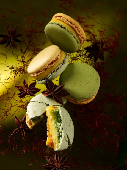 Dualité des couleurs de la coque moelleuse par analogie aux saveurs qu’elle renferme, ce macaron a le goût raffiné des terres orientales. Une juste alchimie entre le safran parfumé et l’anis suffisamment subtil pour le laisser fleurir, qui s’épanouit dans le temps. Enfin, le safran s’efface, l’anis reste.