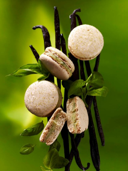 Merveilleux jardin que ce macaron qui, au creux de sa coque opaline, renferme une crème aux saveurs de vanilles (Tahiti, Mexique et Madagascar) et de basilic grand vert. Si la plante aromatique s’affirme aux premiers instants, le second souffle se veut vanille, pour ne laisser enfin au palais que la note juste du paradis.
