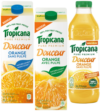 L’acidité est la première barrière gustative à la consommation de jus d’orange au petit-déjeuner(1). Pour répondre aux consommateurs qui aiment le jus d’orange mais le trouvent parfois trop acide, Tropicana a créé la gamme Tropicana Pure Premium Douceur, une gamme 100% pur fuit pressé de jus d’orange au goût particulièrement doux. Un jus approuvé par 80% des consommateurs interrogés(3) , pour bien commencer la journée tout en douceur.