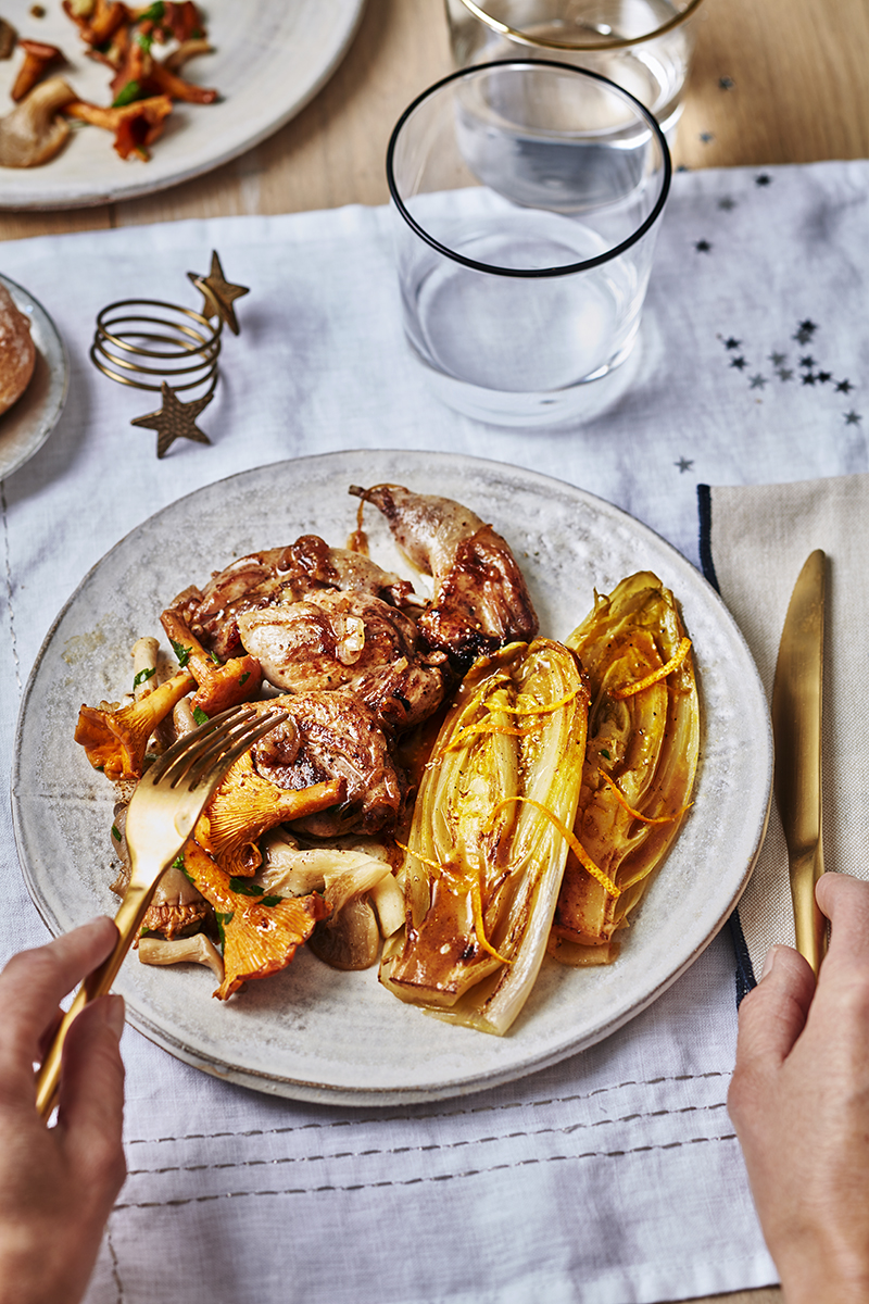 Endives braisées à l’orange, filet de cailles aux champignons et au cognac