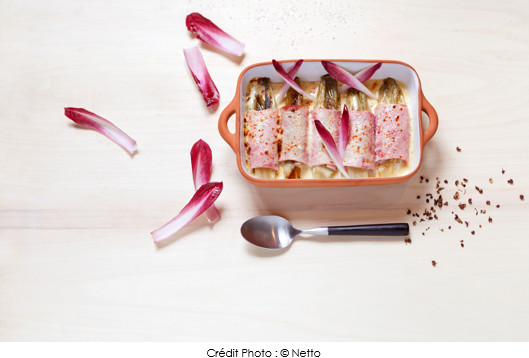 Pour retrouver un côté croquant, faites des plumes d’endives rouges crues et disposez-les sur le gratin.