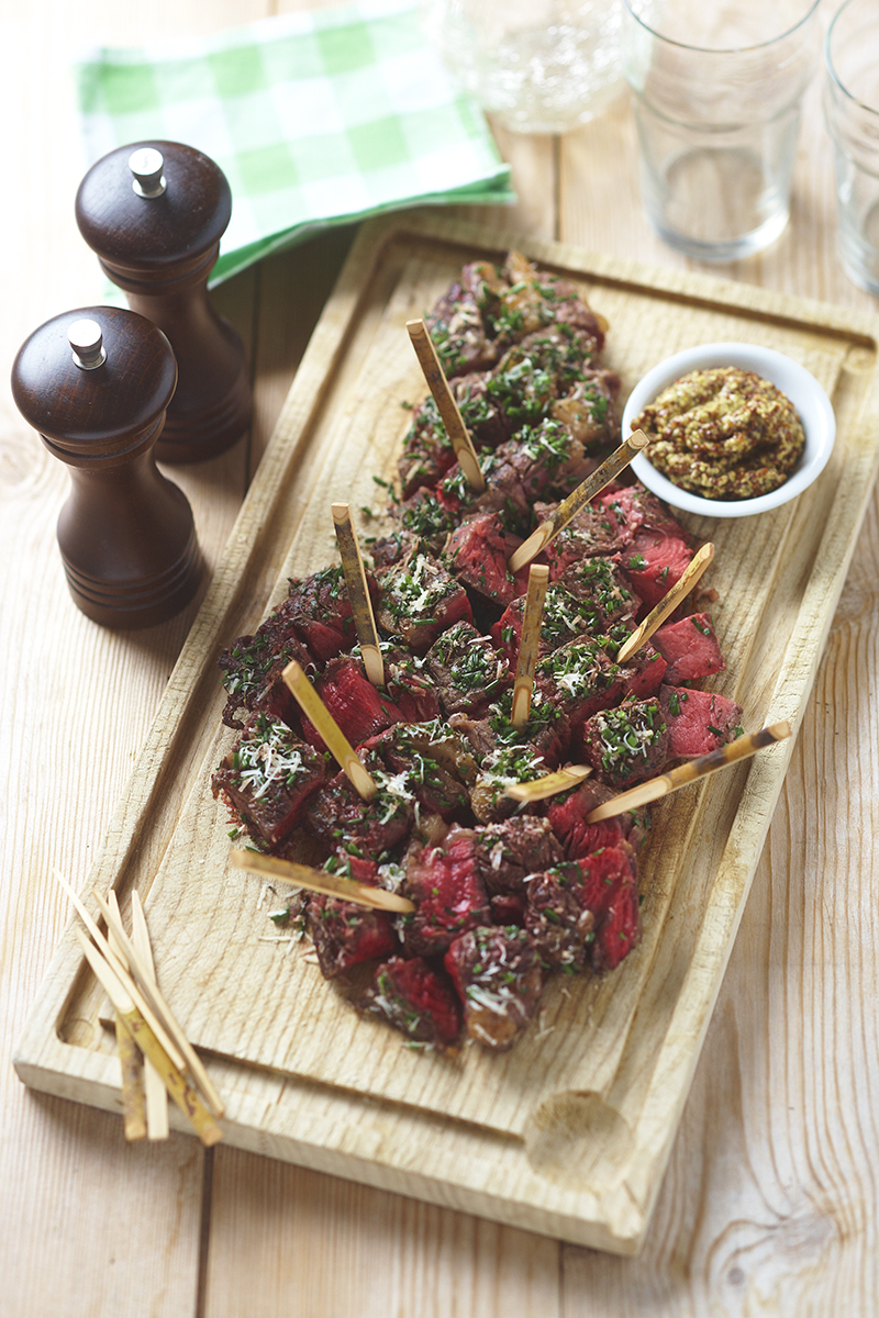 Servir l’entrecôte en croûte d’herbes et de Parmesan tiède ou froide à l’apéritif.
