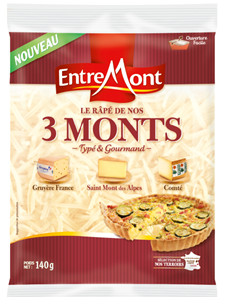 Et, pour aller plus loin encore, Entremont a décidé de l’associer à deux fromages d’origine : l’IGP1 Gruyère France et l’AOP2 Comté, pour nous concocter un râpé typé et gourmand, capable de rehausser nos bons p’tits plats : « Le râpé de nos 3 Monts », ce qui nous donne 2 offres nouvelles au rayon libre-service.