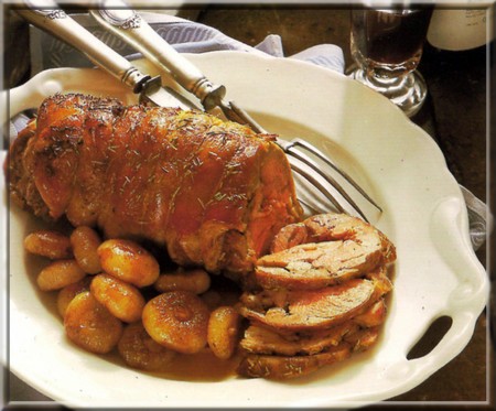 1.Préchauffer le four à 180°C (th.6). Dans un bol, mélanger moutarde, bouillon, sel poivre et romarin. Enduire la viande de cette mixture.