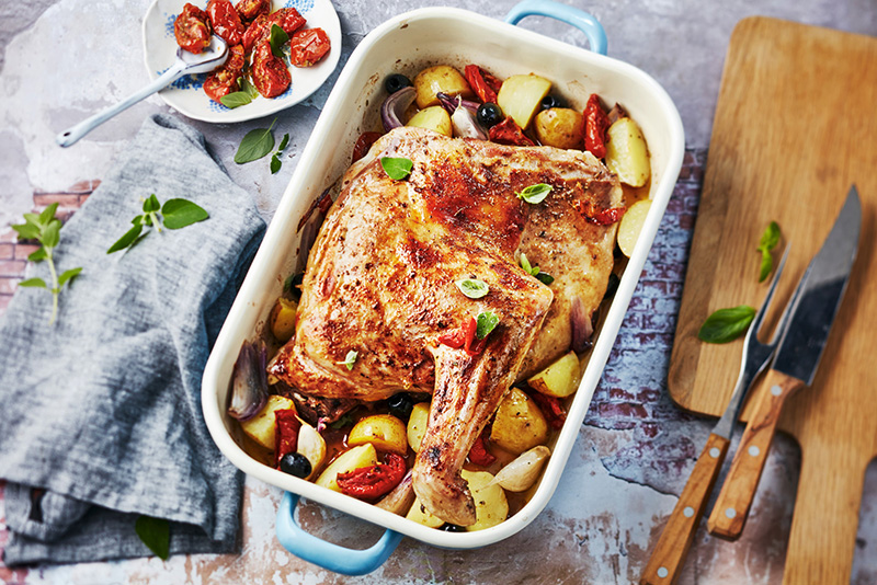 ②• Déposer l’épaule de chevreau avec les oignons taillés en lamelles, les pommes de terre coupées en deux, les tomates séchées et les olives dans un grand plat allant au four.