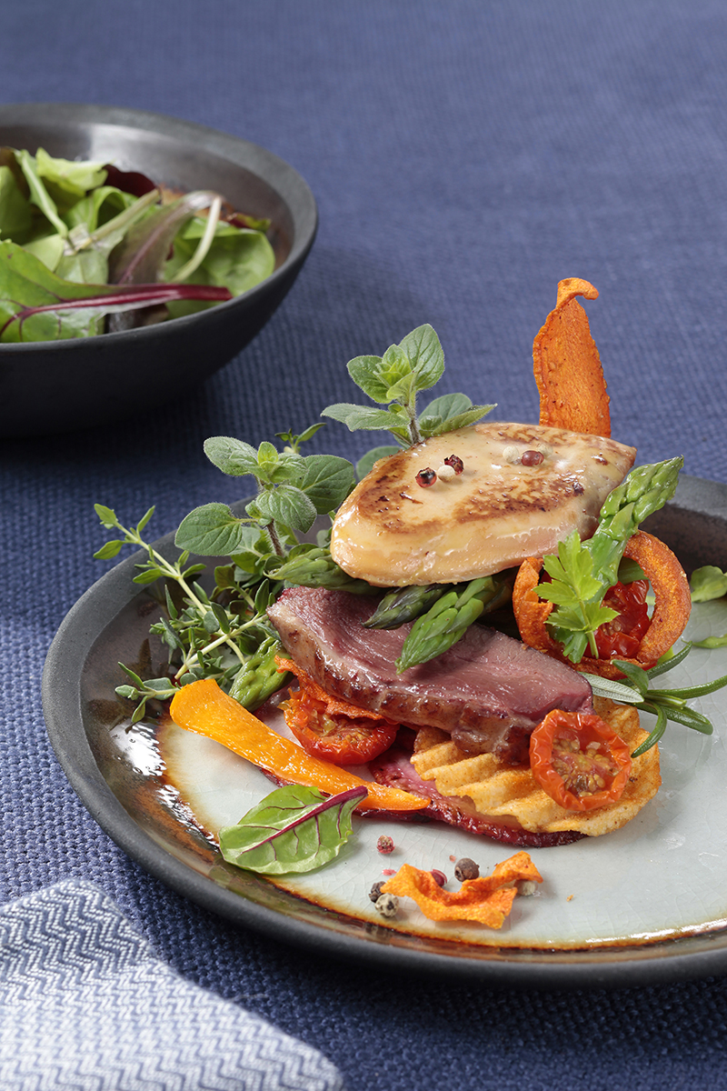Équilibre de Magret et Foie Gras poêlé aux petits légumes
