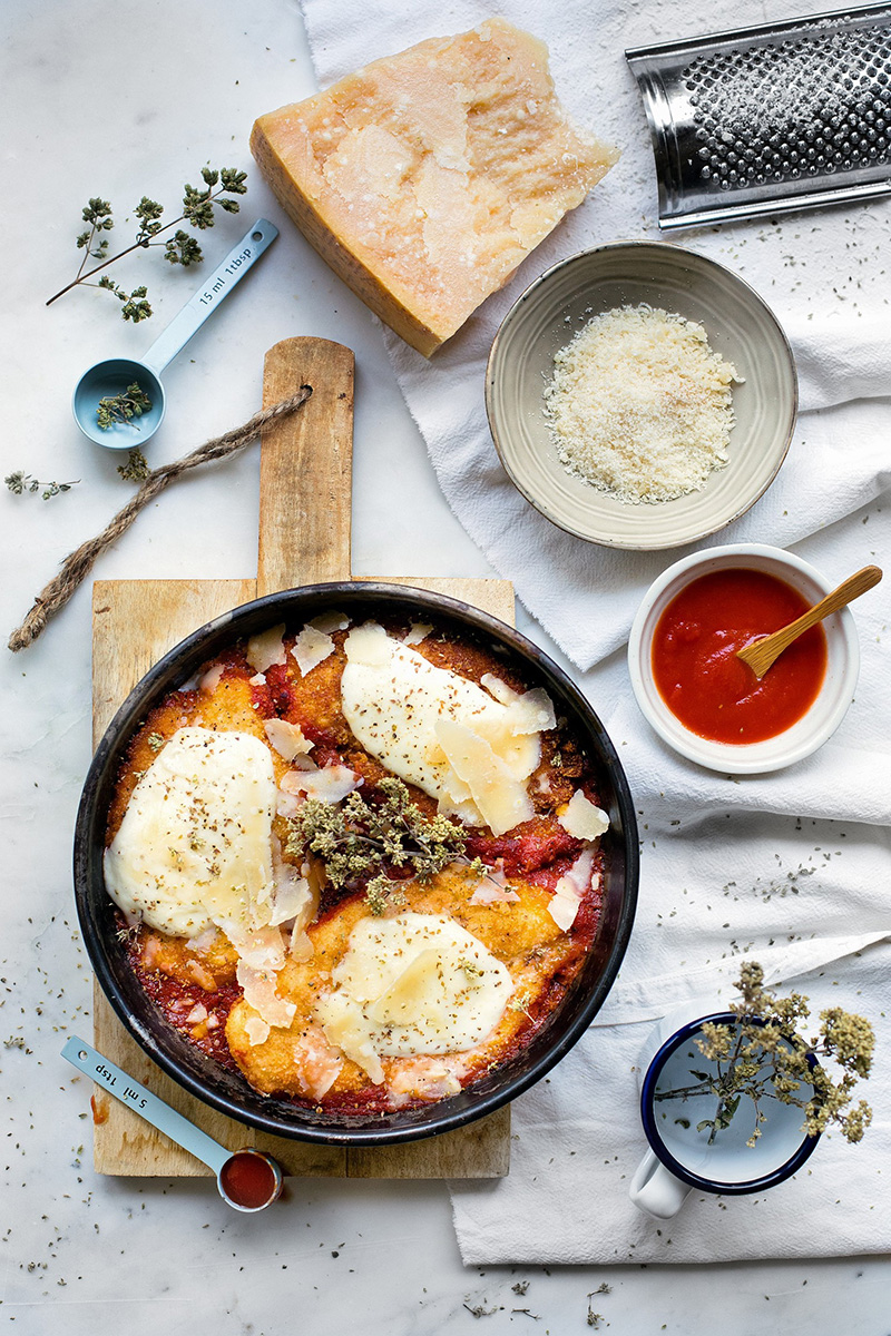 ①• Couper la mozzarella en tranches et l’assaisonner d'huile d’olive, de sel, de poivre, d'origan et d'une pincée de piment séché. Mettre la mozzarella de coté. Mélanger la chapelure, le parmesan râpé et le zeste de citron. Dans un autre plat casser et battre les œufs à l’aide d’une fourchette. Tremper les escalopes de poulet dans l’œuf battu, puis les fariner dans la chapelure.