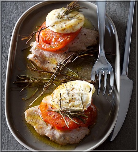 3- Disposerz les demi-escalopes dans un grand plat à four puis, posez sur chacune d’elles une tranche de tomate et une autre de chèvre. Salez, poivrez, arrosez d'huile d'olive, saupoudrez de romarin et cuire 7 à10 minutes au four jusqu’à ce que la viande soit moelleuse et le chèvre légèrement fondant.