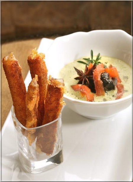 1 – Paner les bâtonnets de Comté dans le mélange œuf, farine et chapelure. Réserver au frais.