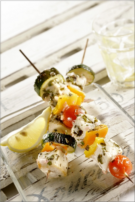 4• Garnir 8 piques à brochettes en alternant l’espadon coupé en cubes avec les courgettes, les poivrons et les tomates.