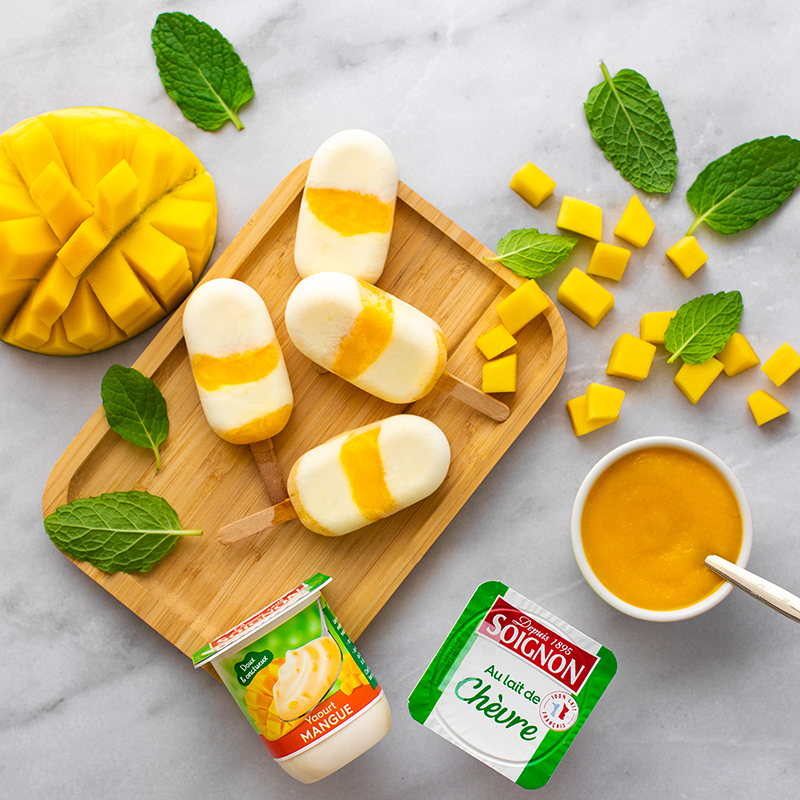 Rafraîchissez-vous avec cette recette ultra rapide et facile d’esquimaux glacés au lait de chèvre et à la mangue SOIGNON !