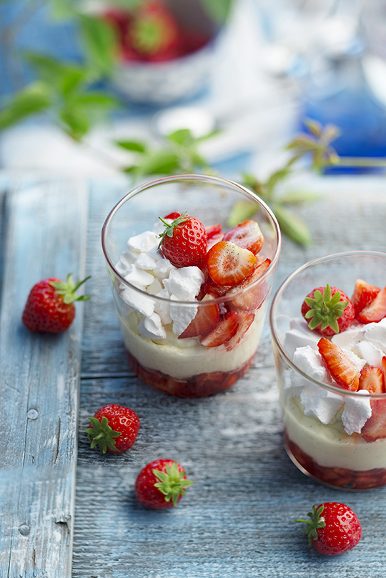 – Répartir les fraises coupées en cubes dans le fond des 4 verres, ajouter une couche du précédent mélange, disposer les fraises coupées en deux.