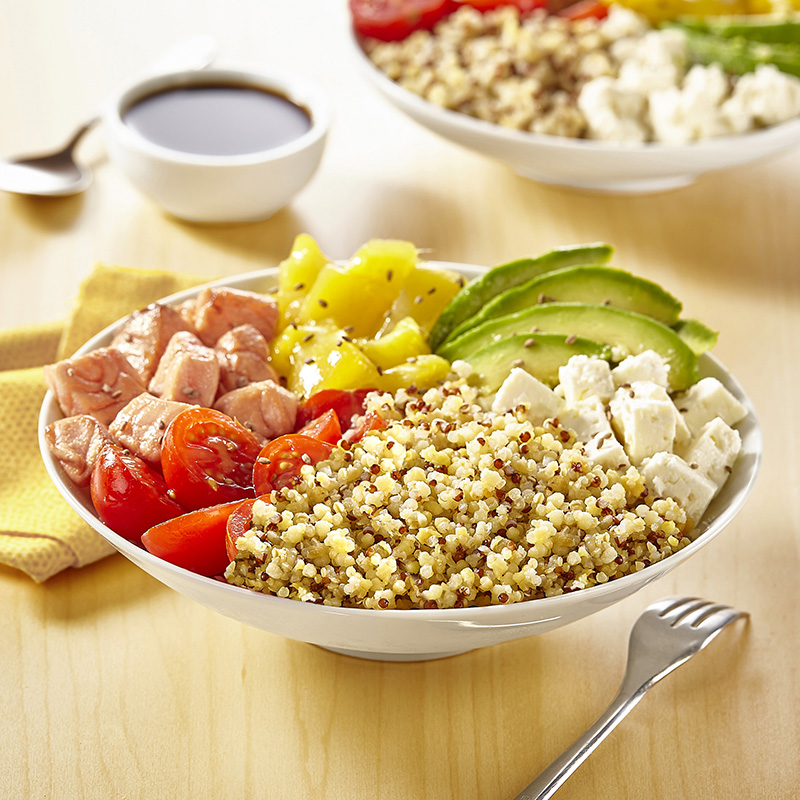 ③• Disposez dans chaque bol une portion de Quinoa Délice, puis à côté une portion de tomates, de saumon, de mangue, d’avocat et de feta.
