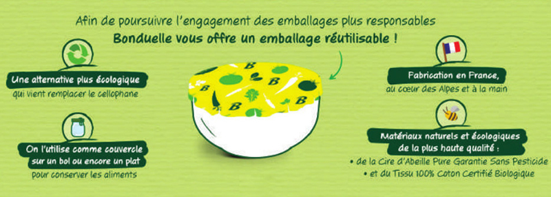 Du 6 avril 2021 au 28 mai 2021 après achat de deux produits parmi les Salades Traiteurs et/ ou Salades en sachet porteurs de l’offre, la marque offre un emballage en tissu réutilisable à l’infini ! Et pour se faciliter la vie tout en réduisant son impact environnemental en cuisine, Bonduelle dévoile sa recette pour créer un emballage alimentaire réutilisable.
