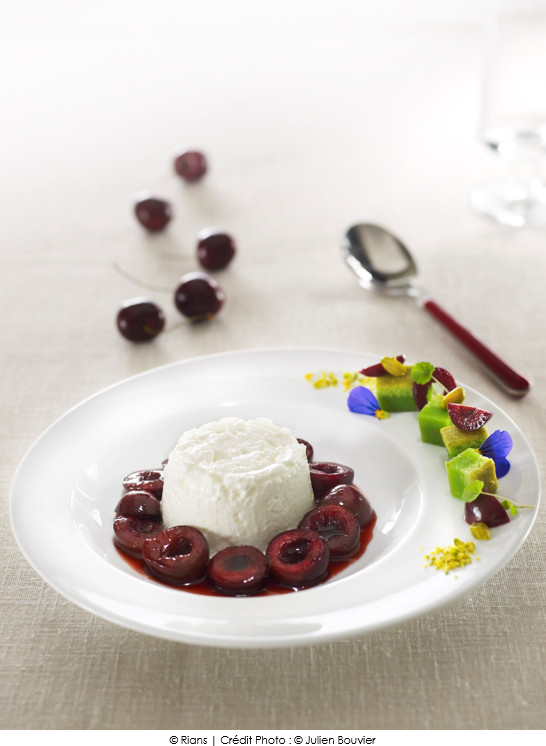 Dressage : Démouler la Faisselle au milieu d’une assiette, répartir les cerises autour et napper avec la sauce chaude.