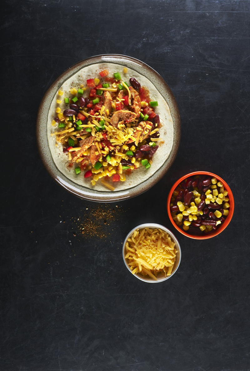 Proposez les Fajitas, la garniture au poulet, les légumes et le cheddar râpé séparément, afin que chacun puisse composer ses Fajitas selon son envie.