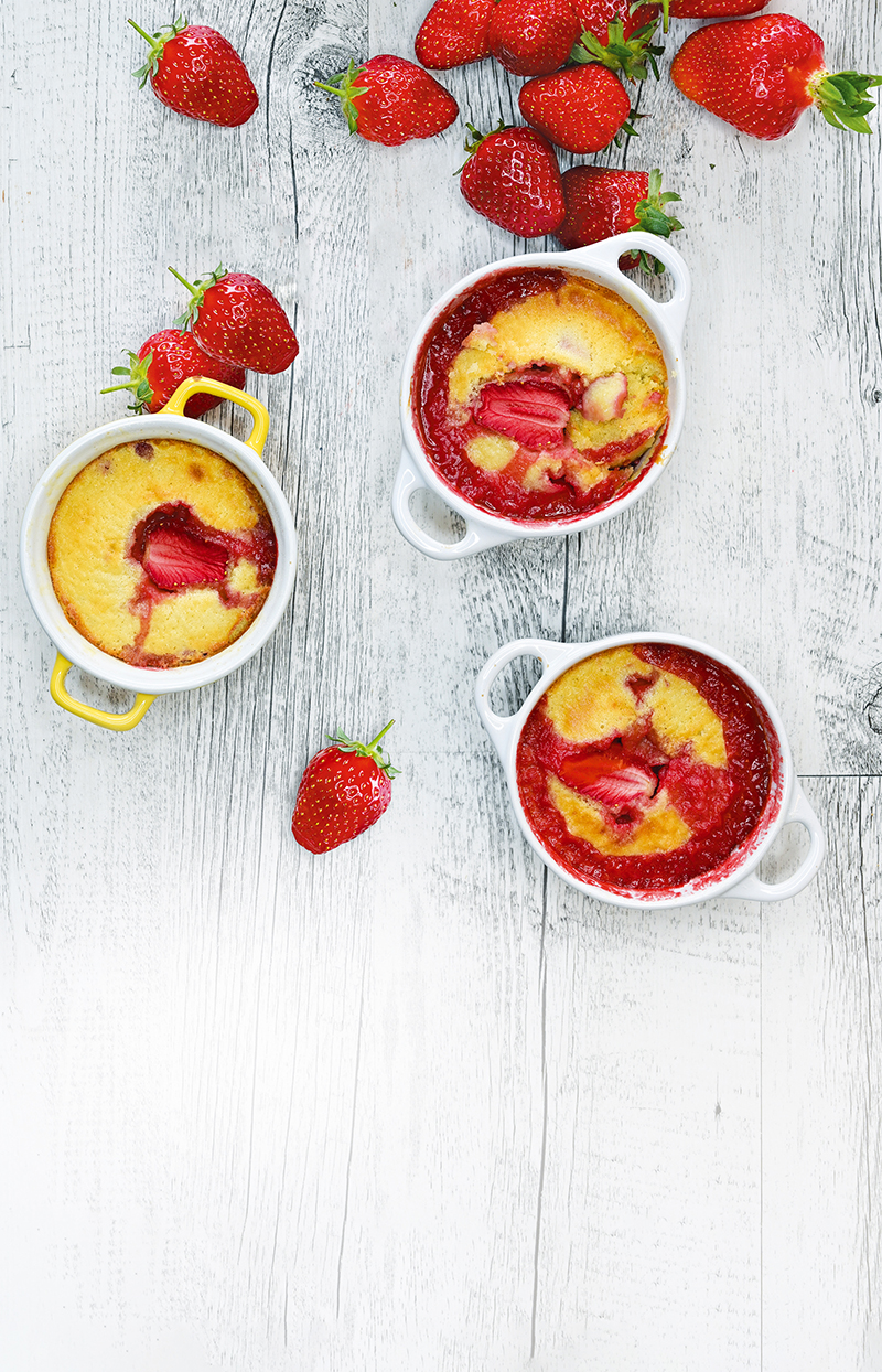④• Pendant ce temps, faire fondre 30 g de beurre à feu doux. À l’aide d’un pinceau, beurrer le plat. Répartisser la préparation des fraises poêlées dans le plat et verser dessus la pâte.