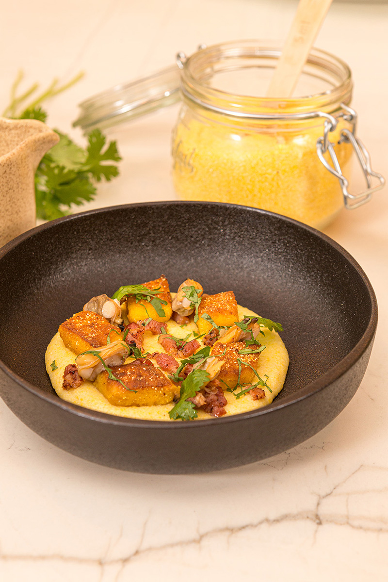 Farine de maïs en gnocchi, polenta crémeuse et crème de coques