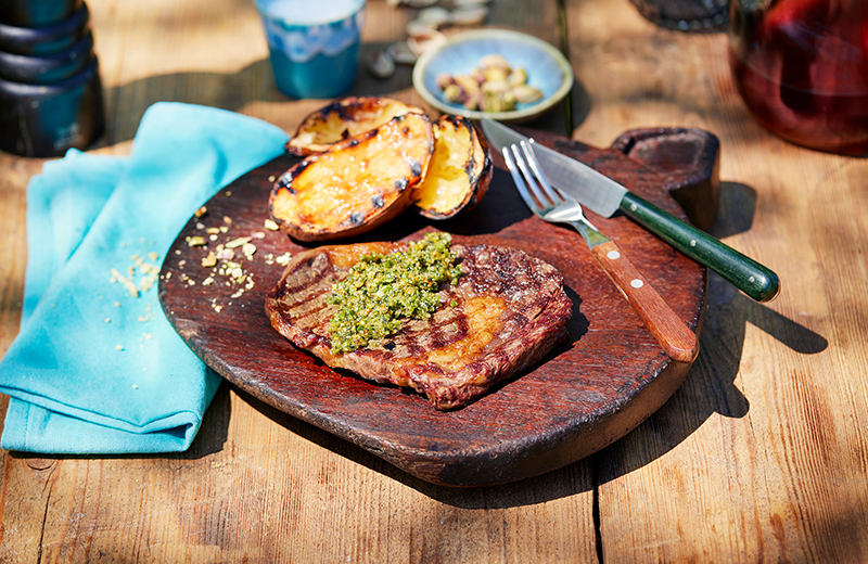Faux-filets à la patate douce, sauce aigre, basilic et pistache