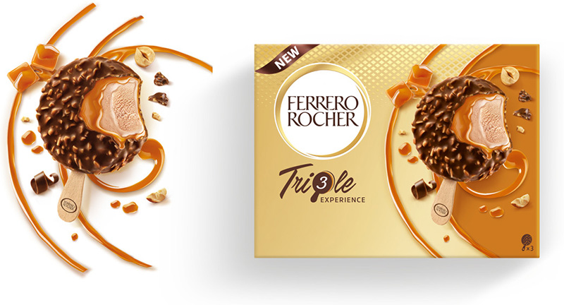Ferrero Rocher a su prolonger le plaisir de sa célèbre bouchée au bon goût de noisettes avec une version glacée Classic. La nouvelle création Triple Experience va encore plus loin. Dans sa coque au chocolat au lait avec des éclats de noisettes se cache toute la douceur d’une glace au bon goût de noisette… relevée d’un délicieux coulis saveur caramel.
