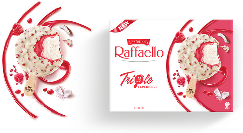 Fort du succès de sa déclinaison glacée, Raffaello revient avec sa nouvelle recette Triple Experience Framboise. Cette nouveauté combine une onctueuse glace au bon goût de noix de coco accompagnée des notes acidulées et fruitées d’un savoureux coulis saveur framboise et fruits rouges, le tout enrobé d’une coque croquante parsemée de noix de coco râpée et d’éclats de framboises.