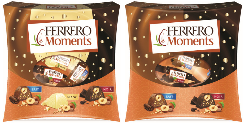 Afin de satisfaire tous les gourmands, Ferrero Moments se décline en 3 saveurs : chocolat au lait, chocolat blanc et chocolat noir.