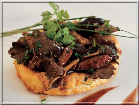 Retirer les cercles de pâte feuilletée du four, les placer dans des assiettes. Répartir dessus le mélange les champignons et les foies, verser un cordon de sauce. Servir !