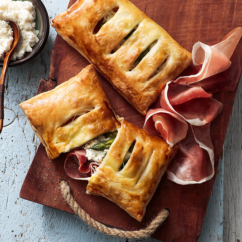 ④• Sur la pâte feuilletée sans les fentes, mettre un peu de Jambon de Parme, de ricotta et d'asperges.