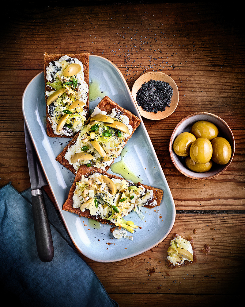 Feuilletés minute à la crème de chèvre, fondue de poireaux et olives Gordal