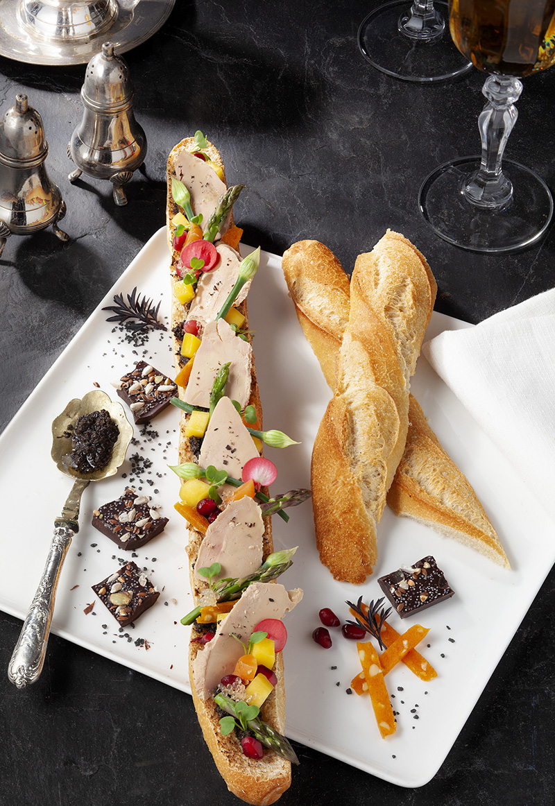 Pour la ficelle canaille au Foie Gras : un décor élégant (on tire du placard ce qui ne sert que rarement : la petite argenterie chinée et les beaux verres à pied par exemple…) et original, des carrés de chocolat aux graines… oui oui c’est très complémentaire ! Sans oublier le couteau pour la découpe : un morceau pour chacun, c’est ça la baguette repas !