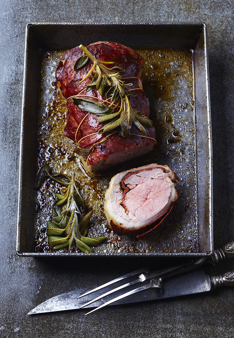 ③• Étaler le filet d’agneau, disposer la moitié du chorizo au centre et ajouter quelques feuilles de sauge, le rouler, le couvrir avec le reste du chorizo et 1 branche de sauge, le ficeler, le disposer dans un plat, l’arroser d’huile d’olive, le saler, le poivrer et le cuire 25 minutes au four. Le laisser reposer quelques minutes avant de le couper en tranches épaisses.
