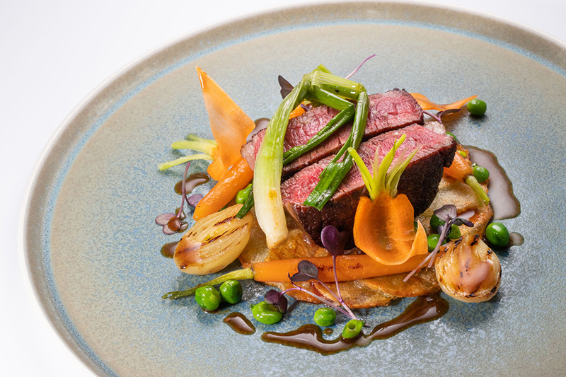 Filet de bœuf, pommes de terre Anna, oignons et carottes caramélisées