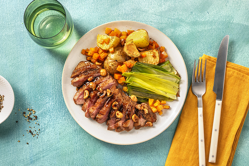 Disposez la canette dans les assiettes. Ajoutez le butternut et les grenailles à côté. Ajoutez le poireau et parsemez de noisettes.