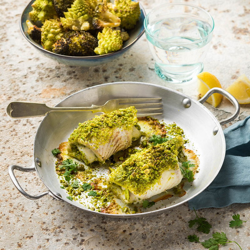 Filet de carrelet en croûte de pistaches, brocoli et chou romanesco rôtis au four