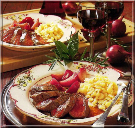 4-Pendant ce temps, filtrer la marinade et la mettre dans une casserole. Éplucher, couper en quartier et ajouter les oignons. Couvrir et faire mijoter à feux doux 15 minutes. Les servir avec le filet.