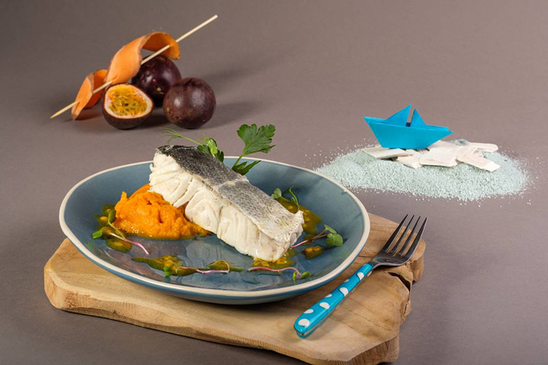 ⑦• Au centre d’une assiette, à l’aide d’un cercle, déposer l’écrasé de patates douces, puis le filet de lieu.