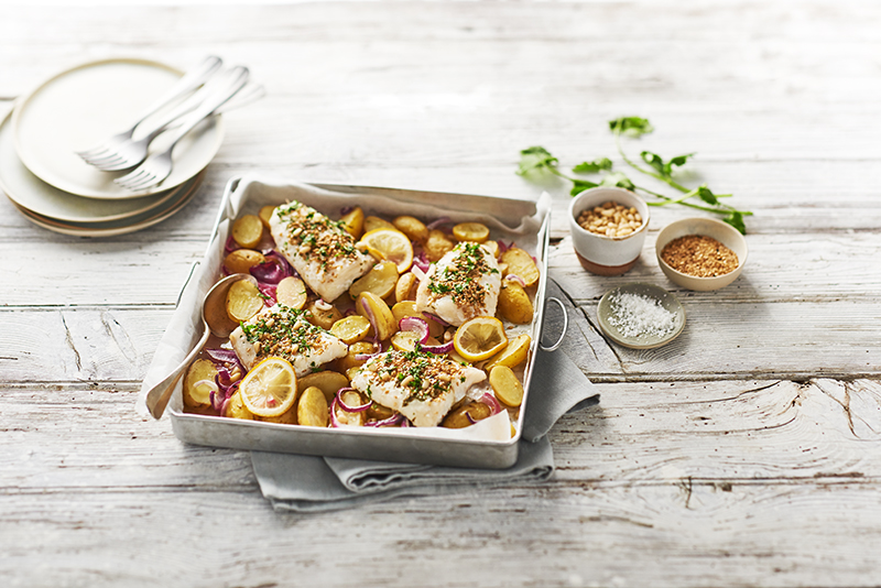 ④• Disposer les pommes de terre ainsi que les oignons rouges dans le fond du plat. Déposer les filets de merlu. Ajouter la fleur de sel et les pignons sur la totalité du plat. Ajouter le sésame sur les morceaux de merlu. Déposer 3 à 4 tranches fines de citron jaune.