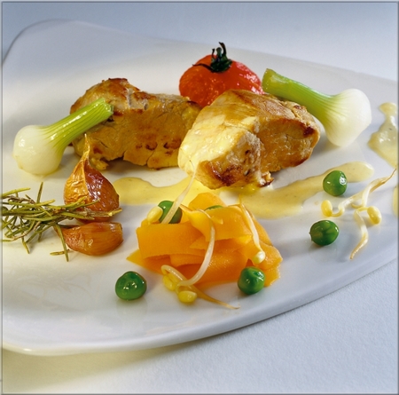 Dresser les tranches de filet de porc accompagnées des légumes sur assiette chaude. Entourer d'un cordon de sauce.