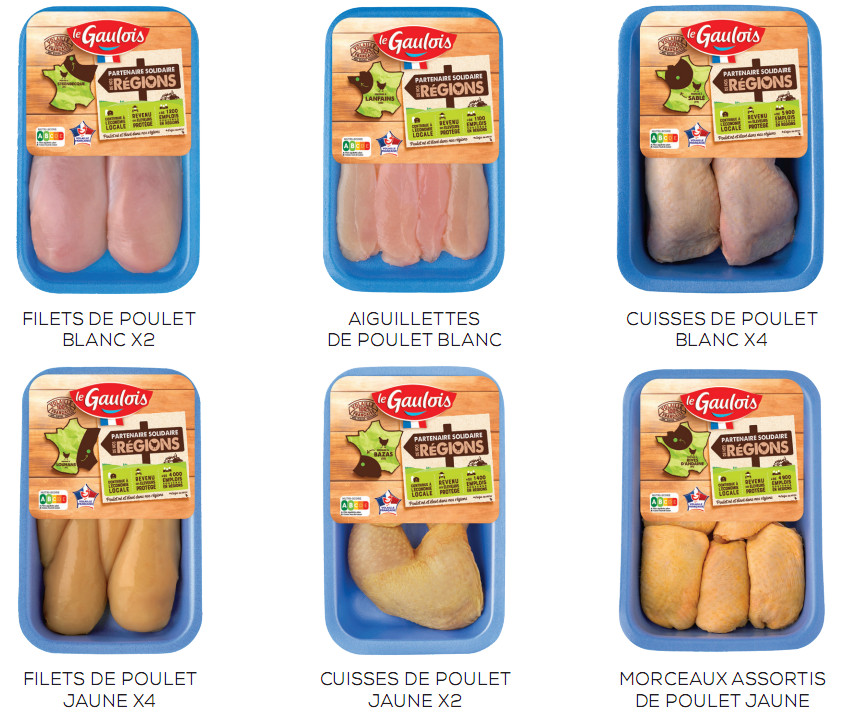 La gamme est déclinée en 6 régions de France entre deux types de poulet, jaunes ou blancs, selon la préférence de consommation régionale :