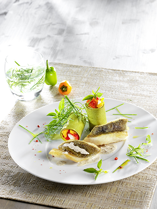 Filet de Saint-Pierre rôti sur la peau et cannellonis de légumes à la sauce champignons