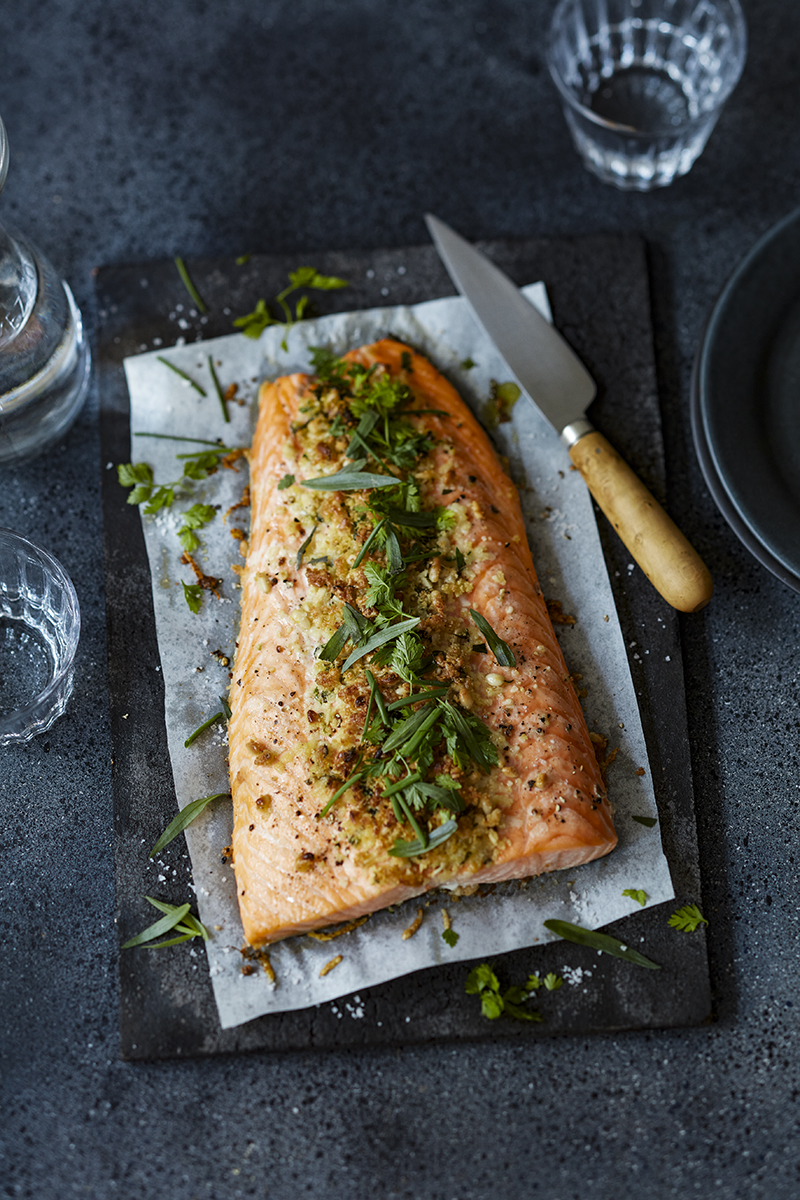 Sortez le saumon Label Rouge du four, répartissez le reste des herbes sur le dessus et servez sans attendre.