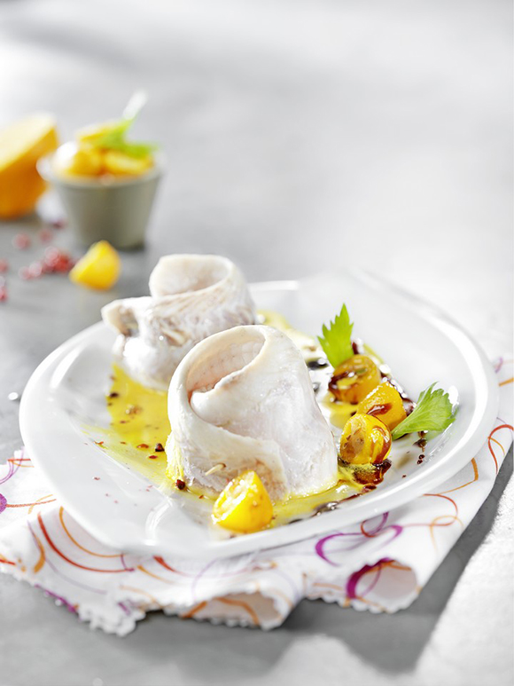 Dresser en assiette chaude, entourer le poisson de sauce crémeuse au safran, de caramel d’orange, kumquats confits et quelques baies roses.