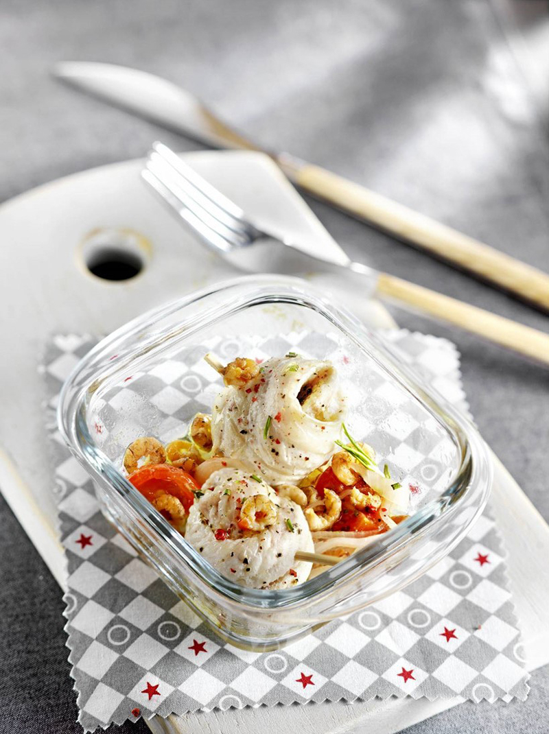 ①• Découper les filets de vive en morceaux équivalents et déposer dans un plat allant au micro ondes. (Ajouter moules décortiquées et crevettes si option choisie).