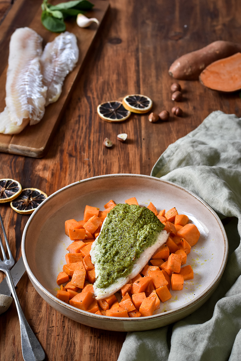 ①• Pelez et coupez la patate douce en cubes avant de la disposer dans un plat. Ajoutez un filet d’huile d’olive, du sel, du poivre, et enfournez (environ 10 min) le temps de préparer le pesto.